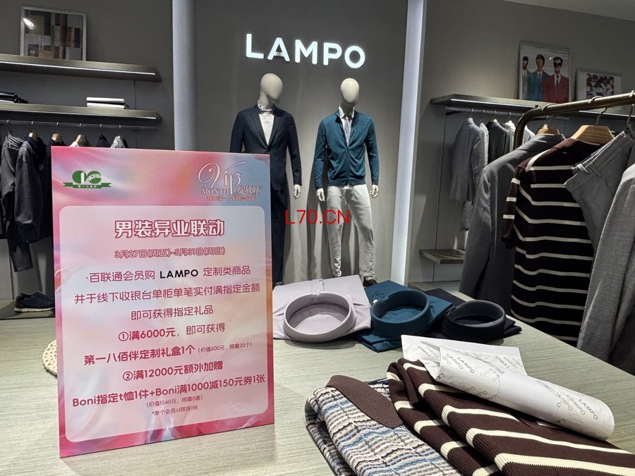 再上五楼,这里汇聚了VSKONE(威斯康尼)、LAMPO(蓝豹)、SATCHI(沙驰)、Callisto(卡利斯特)等多家中高端男装品牌。这里虽不如女装区人头攒动,但客单价却不低。记者了解到,这些品牌均提供一对一量体、面料甄选、细节修改等全流程服务,还可在衣物上刺绣姓名、纪念日、星座等专属印记。这些细节让顾客感受到,买到的不只是一套衣服,更是一张别人无法复制的 “第二张名片”。