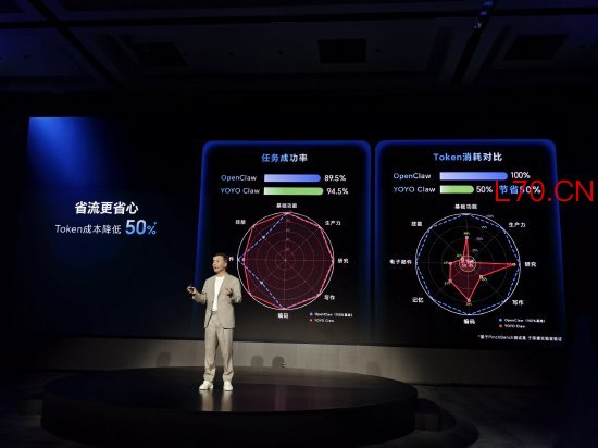 他提到,在任务成功率方面,OpenClaw为89.5%,YOYO Claw达到94.5%;Token消耗对比方面,OpenClaw为100%,YOYO Claw为50%,节省50%。