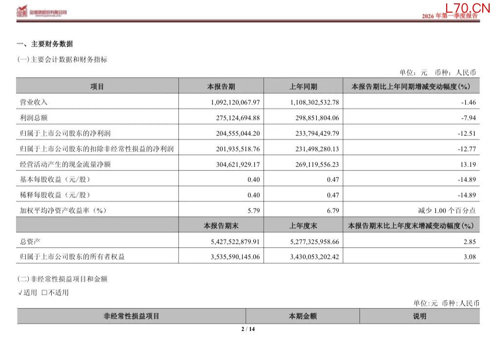 近日,金徽酒披露2026年一季报。数据显示,今年1至3月,金徽酒实现营收10.92亿元,同比下降1.46%,净利润同比下降12.51%至2.05亿元。