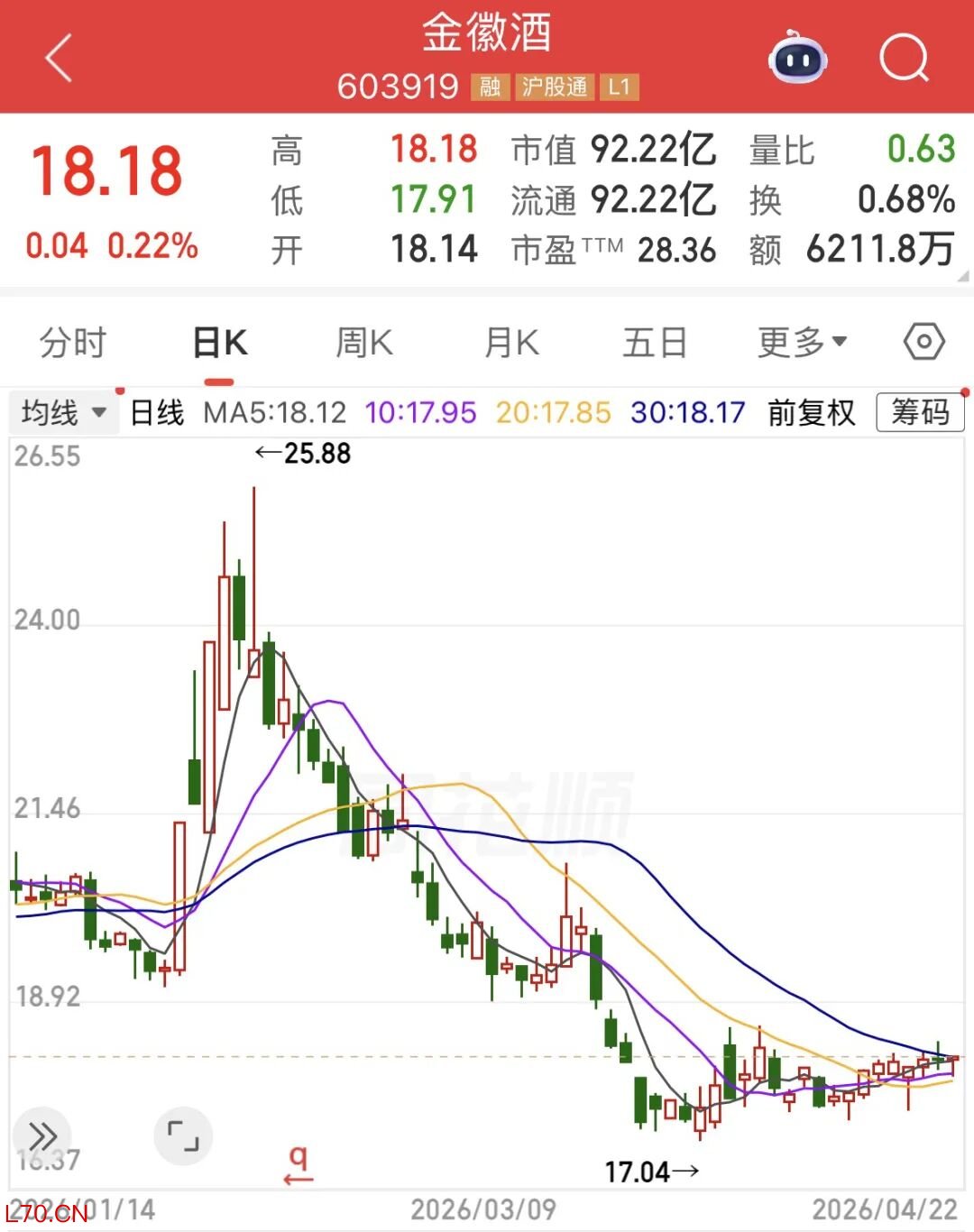 今年以来,金徽酒股价波动较大。4月22日,金徽酒报收18.18元/股,最新市值约为92亿元。