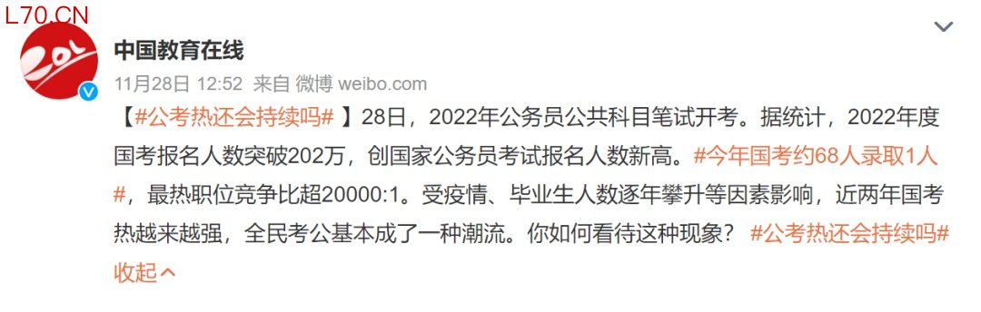 而今年公考已经是热上加热了,国考68人录取一人。明年估计将会更加激烈。