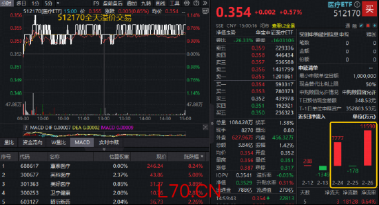 A股医疗板块全天飘红,全市场规模最大医疗ETF(512170)盘中上探1.14%,成功收复年线,成交3.84亿元。场内持续溢价交易,显示买盘态度积极,此前3日512170累获逾1.9亿元净申购。