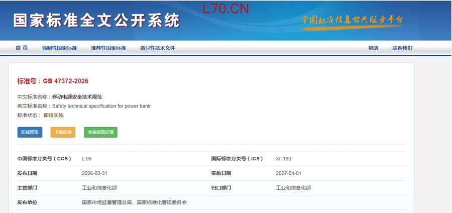 将于2027年4月1日实施的强制性国家标准《移动电源安全技术规范》(GB47372—2026)近日正式发布。业内人士认为,市场或将迎来新一轮“质量洗牌”潮,符合新国标的充电宝价格或将有一定程度上涨。