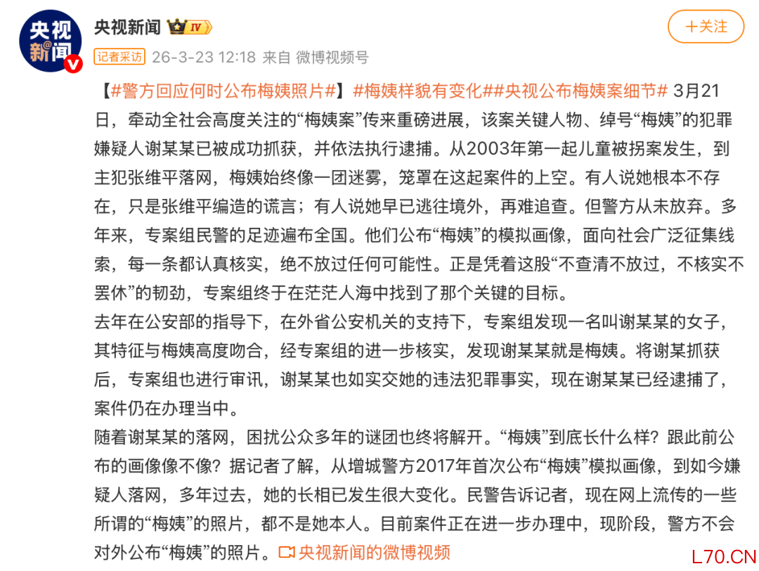 随着谢某某的落网,困扰公众多年的谜团也终将解开。“梅姨”到底长什么样?跟此前公布的画像像不像?据记者了解,从增城警方2017年首次公布“梅姨”模拟画像,到如今嫌疑人落网,多年过去,她的长相已发生很大变化。民警告诉记者,现在网上流传的一些所谓的“梅姨”的照片,都不是她本人。目前案件正在进一步办理中,现阶段,警方不会对外公布“梅姨”的照片。