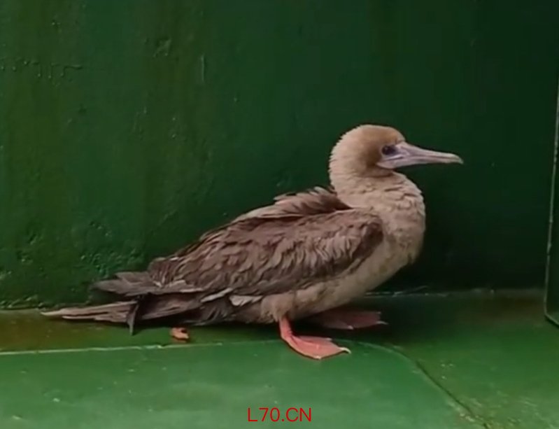 上船的红脚鲣鸟,船员表示,这只鸟“性格”很好,被发现后,一直乖乖地在甲板上的小范围内活动,似乎是第一次见到人类,满眼好奇。 上海海事测绘中心供图