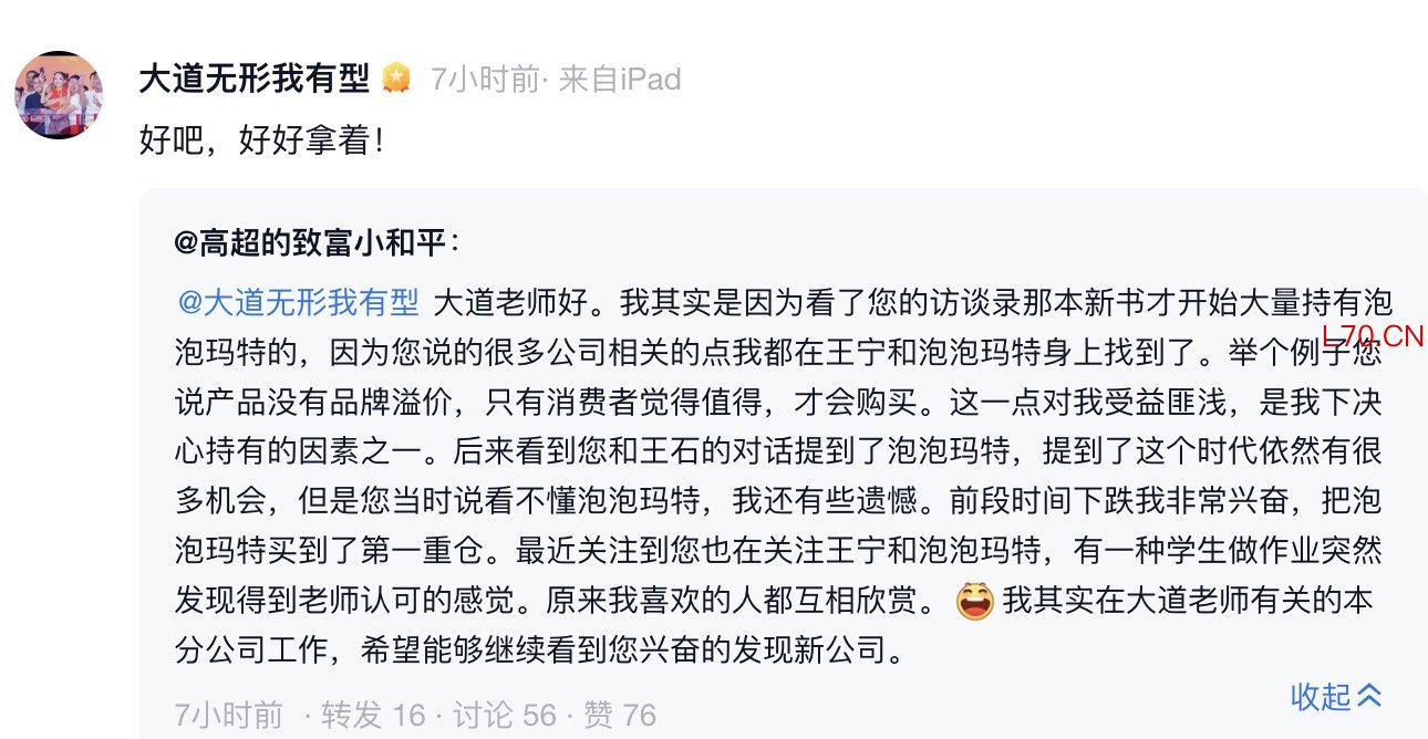 元股证券有投资者说之前趁泡泡玛特股价下跌时重仓买入,段永平回复称:好吧,好好拿着!
