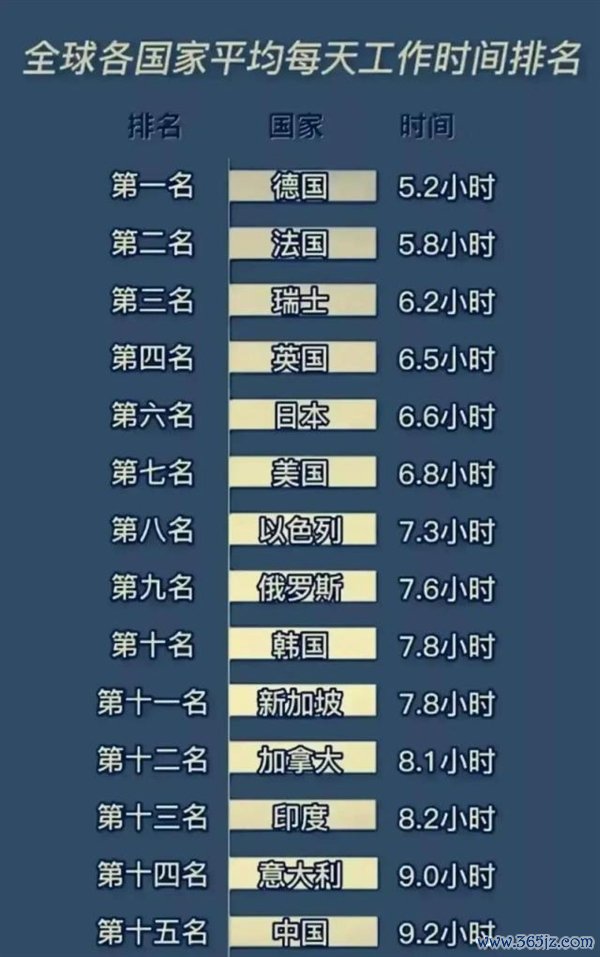 从工作时长来看,有数据统计了15个国家的平均每日工作时间,德国每天的工作时间5.2小时为最短,而中国的每日平均工作时长为9.2小时,排名垫底,时间超过了亚洲邻居日本和韩国。