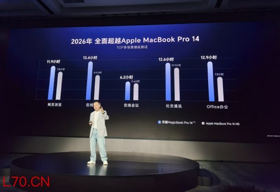 他宣布,荣耀MagicBook系列以HONOR Turbo X技术,创下了16.7小时的X86平台续航纪录,首次超越苹果MacBook Pro 14;另外,荣耀笔记本X Plus系列2026获得行业首个SGS整机卓越可靠性认证,及行业首个键盘IPX2级防水认证。